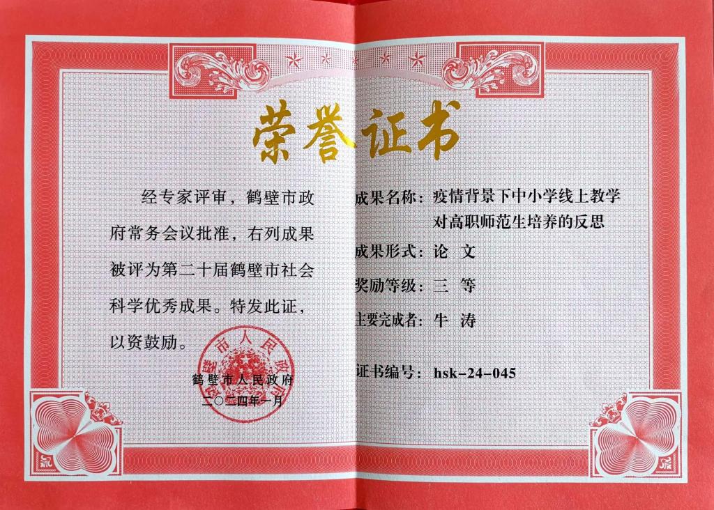 牛涛的论文成果《疫情背景下中小学线上教学对高职师范生培养的反思》经专家评审,市政府常务会议批准,被评为鹤壁市第二十届社会科学优秀成果三等奖。